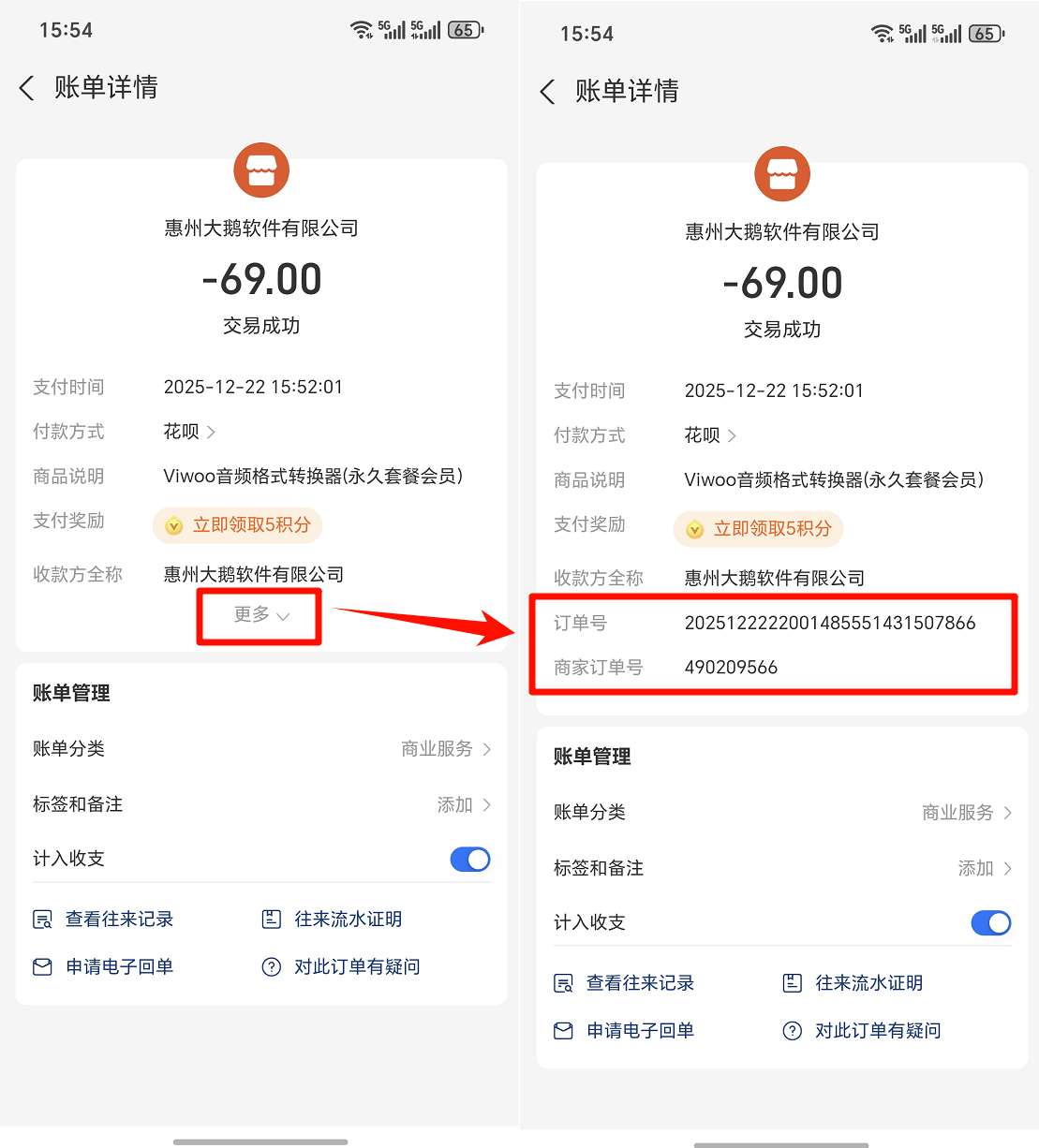 5️⃣点击该账单,就可以看见商品的【交易单号】和【商户单号】。如果需要报给相关的工作人员,可以复制【交易单号】。
