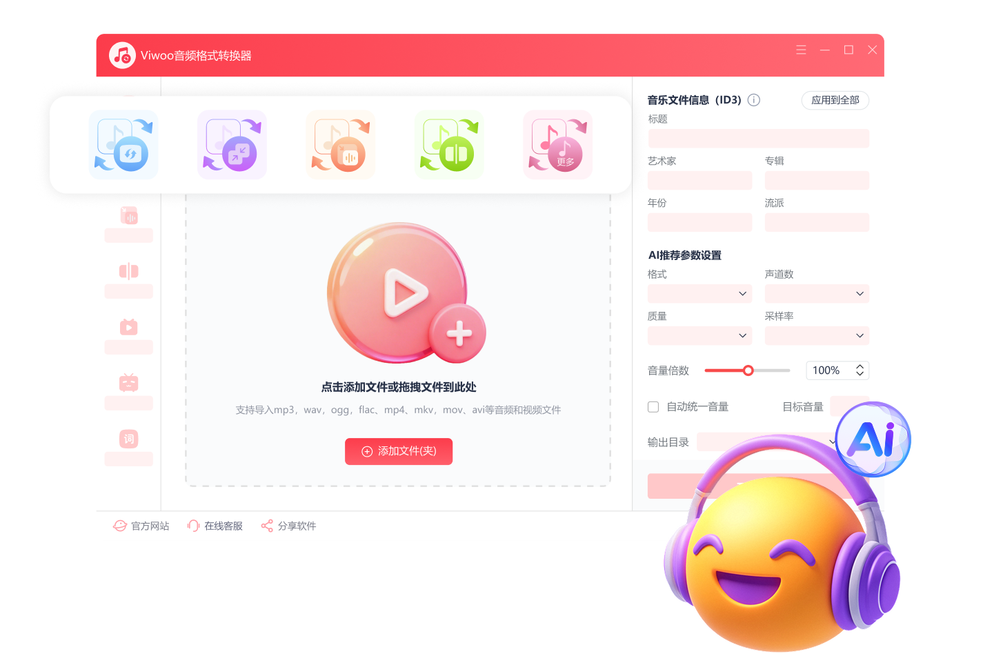 Viwoo音频格式转换器是一款涵盖音频转换,音频合并,视频转音频,音频分割,音频压缩,视频音频提取,调整声音大小功能,支持所有主流音频格式间的互转