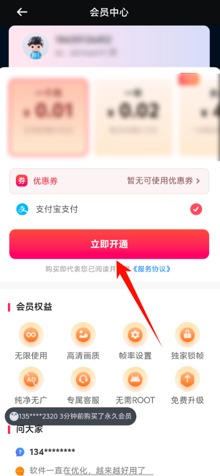 点击「我的」页面中提示“立即开通”,可选择购买相应的套餐(软件套餐偶尔变更,以实际情况为主),支付宝(花呗/信用卡)或微信(信用卡)支付后,套餐立即生效。