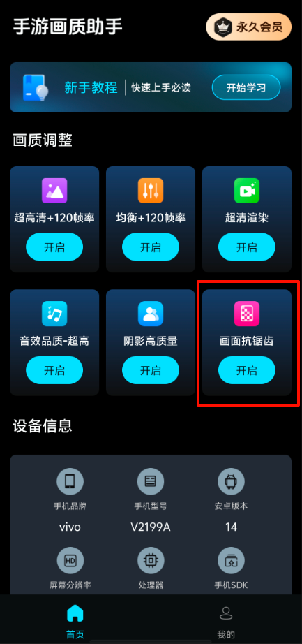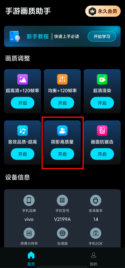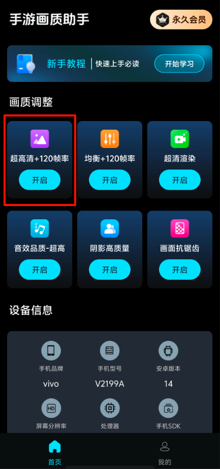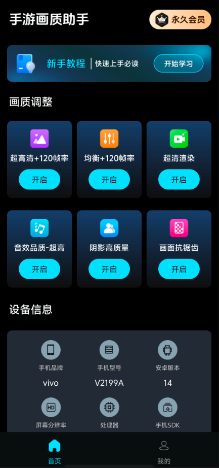 首页分为“画质调整”和“设备信息”两大板块。画质调整板块清晰展示了各项画质调节选项,如“超高清+120帧率、均衡+120帧率、超清渲染、音效品质-超高、阴影高质量、画面抗锯齿”等;设备信息则展示了“手机品牌、手机型号、安卓版本、屏幕分辨率、处理器、手机SDK”等。您可以根据自己的设备性能和游戏需求,一键选择相应模式。