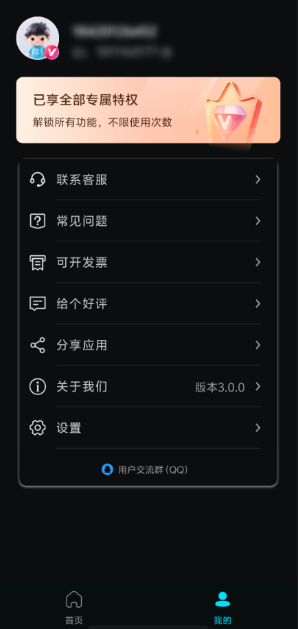 点击「我的」按钮,可以查看「联系客服」、「常见问题」、「分享应用」、「关于我们」、「设置」等内容。